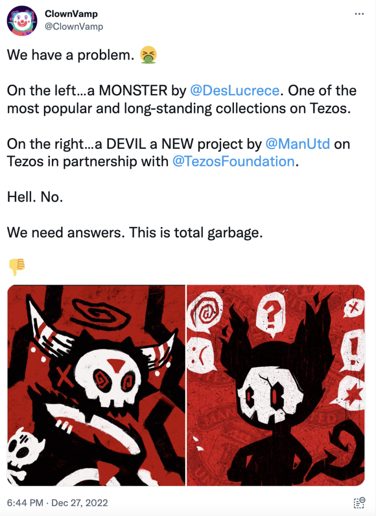 あるTwitterユーザーは、マンチェスター・ユナイテッドの「The Devils」コレクションと、OpenSeaで現在17.5ETH(20,825ドル)のフロアプライスをつけているDes Monstersコレクションで知られるNFTアーティストのペンネームDesLucreceの作品が似ていると非難しているのです。並べて比較すると、ほぼ同じキャラクターが配色や似たような目、角などを共有しています。