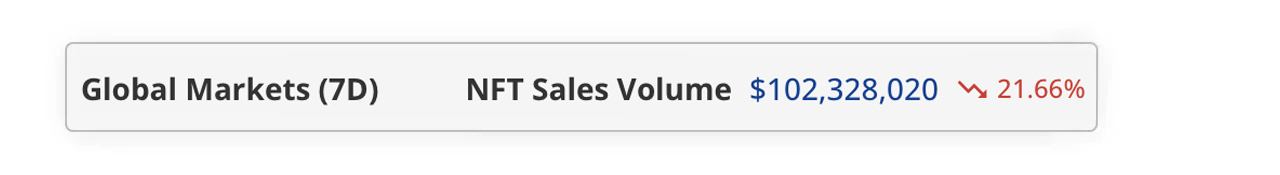 NFTの売上は今週大幅に減少しており、これは暗号通貨市場全体の低迷と相関しています。cryptoslam.ioによると、記事執筆時点では、NFTの売上は過去7日間で102,328,020ドルに達したことがデータから示されています。