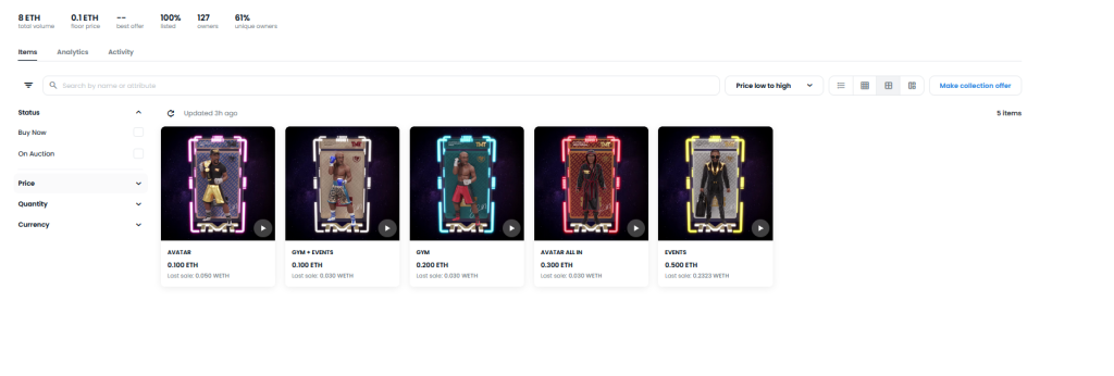 マーケットプレイスに掲載されているMaywevereコレクションの1つには、価格履歴のない非売品のトークンが73個含まれています。別のものには5つのNFTが含まれており、これらはすべて最終的に0.050 Wrapped ETH(60ドル)未満で販売されていますが、フロアプライスは0.1 ETH(121ドル)になっています。