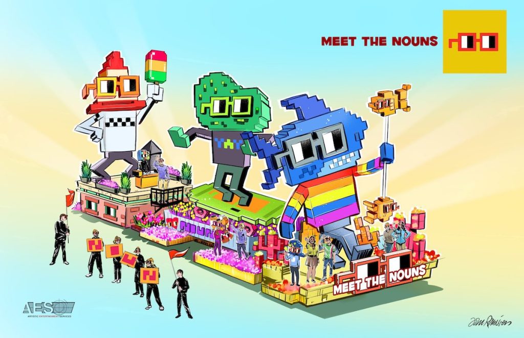 Nouns NFTプロジェクトは、すでにスーパーボウルのコマーシャルやインディー映画に登場しています。次に、ピクセル・キャラクターと箱型メガネ(Noggles)は、Nouns DAOの投票と資金提供により、来週のローズ・パレードの一部として現実世界に飛び込むことになりました。