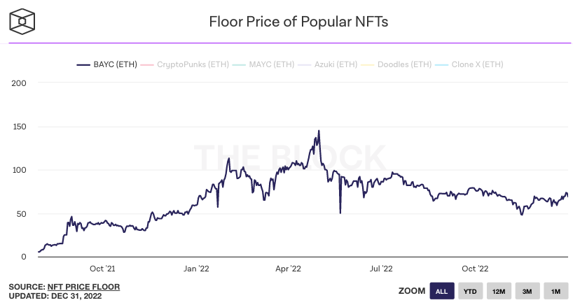 The BlockのData Dashboardによると、Yuga Labsが支援するNFTプロジェクトBored Ape Yacht Club(BAYC)は、69ETH、つまり82,740ドル前後のフロアプライスで1年を終えました。