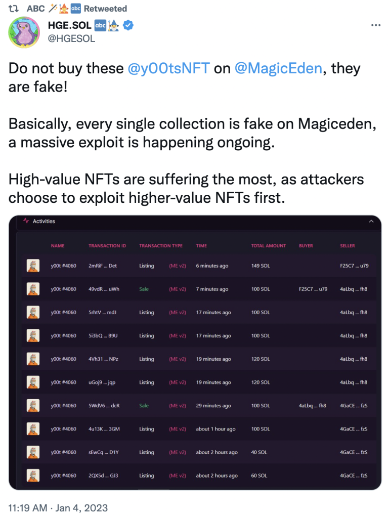 また、同じユーザーが、Solanaベースの人気NFTプロジェクト「y00ts」の偽NFTにフラグを立てました。