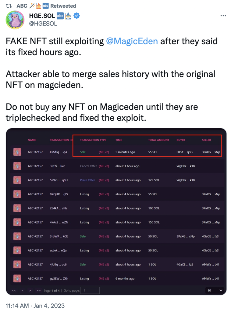 あるTwitterユーザーが示したように、偽物のABC NFTと思われるものが55SOL(740ドル)で販売されていました。