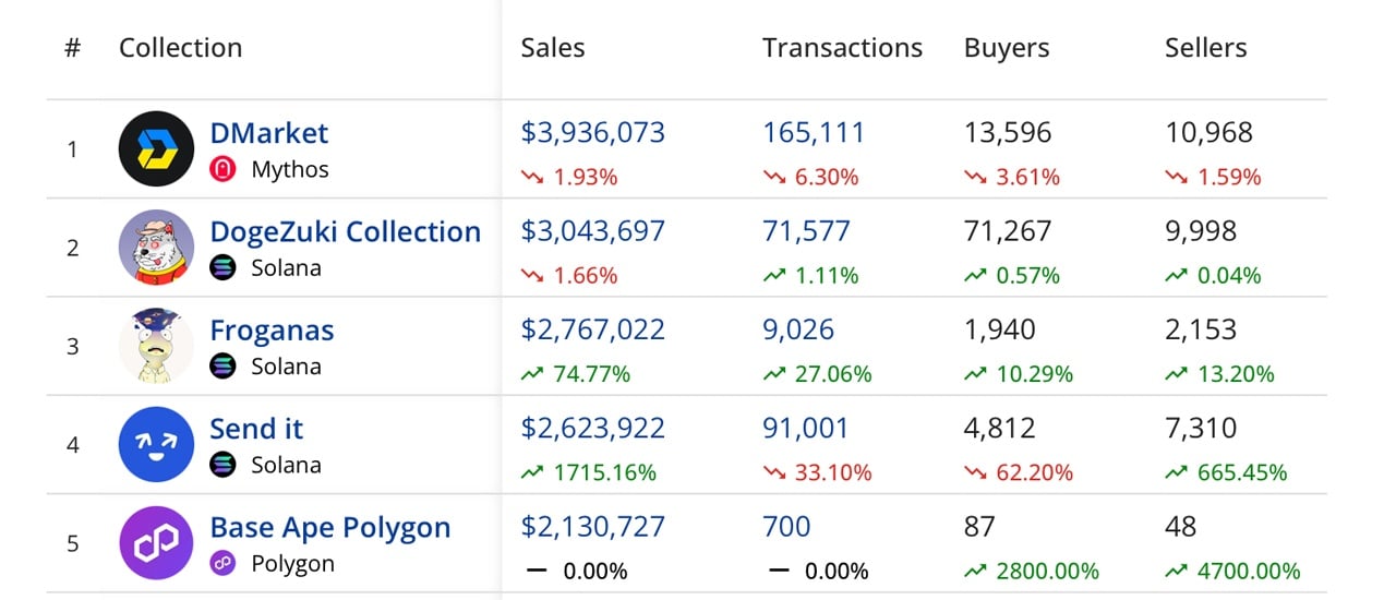今週最も売れたコレクションには、Dmarket(3,930,000ドル)、Dogezuki Collection(3,040,000ドル)、Froganas(2,760,000ドル)、Send It(2,620,000ドル)、Base Ape(2,130,000ドル)などがあります。SolanaのSend Itは1,715.16%の増加、イーサリアムのMocaverseは315.56%の上昇、C_hypcは131.49%の増加を記録し、いずれも3桁から4桁の大幅な成長を記録しました。今週最も高額で売れたNFTは、5日前に360,611ドルで売れたイーサリアムのToken Vesting Plans #582でした。