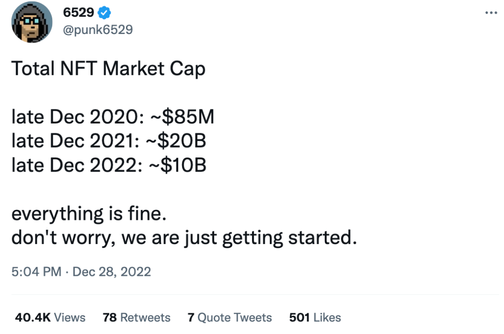 ベアマーケットの重い状況にもかかわらず、印象的な2年間の成長率を記録しました。2021年12月下旬、NFTの時価総額は約200億ドルで、これは今日の出来高より50%高く、2020年12月下旬に比べ23,429%高いです。
