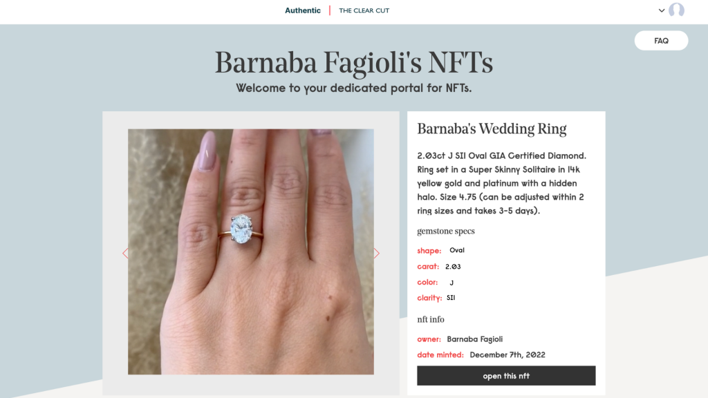 “NFTは、婚約指輪を購入するカップルが、ダイヤモンドの証明書、保険、画像、そしてプロポーズの言葉まですべてブロックチェーン上に安全に保管し、交換しにくい紙のコピーを持ち続ける心配をなくすことができるオプションです。”