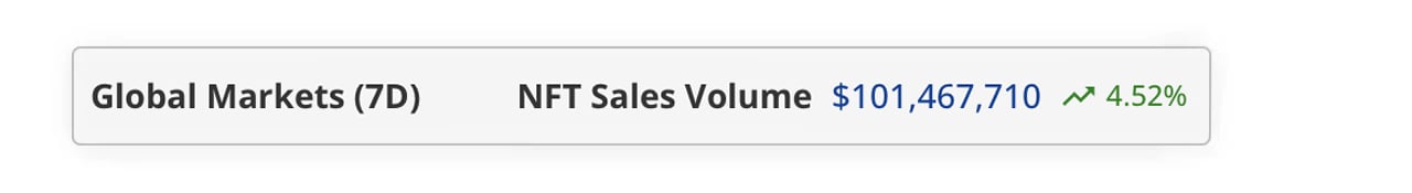 今週の暗号通貨市場は全体的に下落しているものの、非代替性トークン(NFT)の売上は前週に比べて4.52%増加しました。過去7日間のNFTの売上は合計約101,467,710ドルで、イーサリアムベースのデジタルコレクタブルが市場を席巻しています。