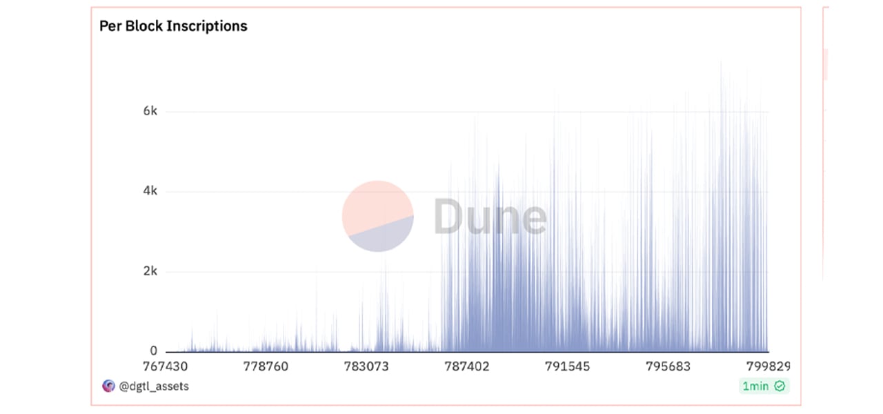 2023 年 7 月 22 日の時点で、ブロック高さ 799,830 で、約 18,599,837 の Ordinal 碑文がビットコイン ブロックチェーン上に発行されました。218日前の最初の記録以来、上昇傾向が続いています。Dune Analytics のアーカイブ統計によると、ビットコインで鋳造されたすべての碑文の 78.5% がプレーン テキスト形式または文字セットであり、さらに 13.5% がプレーン テキストであり、プレーン テキストと文字セットの碑文の合計は 92% になります。碑文の残りの部分は、画像、GIF ファイル、アニメーション、アプリケーションなどで構成されています。