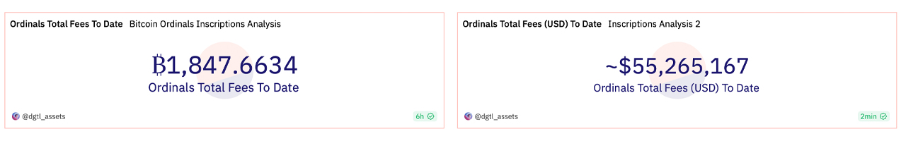 ブロックチェーン上のビットコイン Ordinal の登録数は 1,900 万に近づいており、この傾向は 2022 年 12 月 16 日から過去 218 日間続いています。統計によると、マイナーは約 1,847.66 BTC、約 5,529 万ドル相当の手数料を獲得しており、数百万の Ordinal の登録が確認されています。