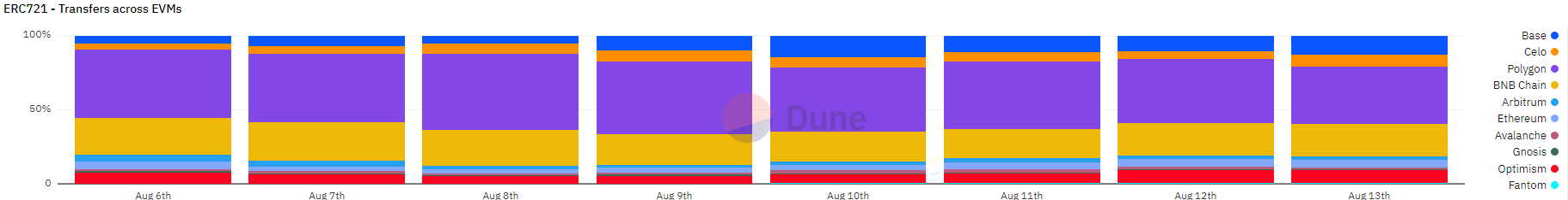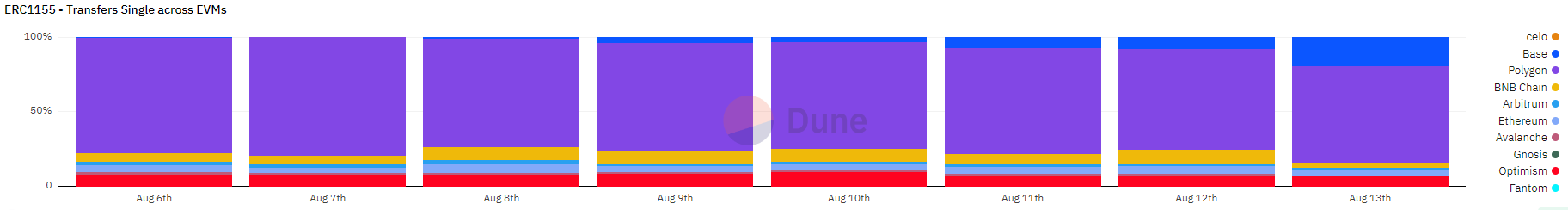 ERC-1155 の転送では、Base が総量に占める Polygon のシェアを直接食い込んだようです。