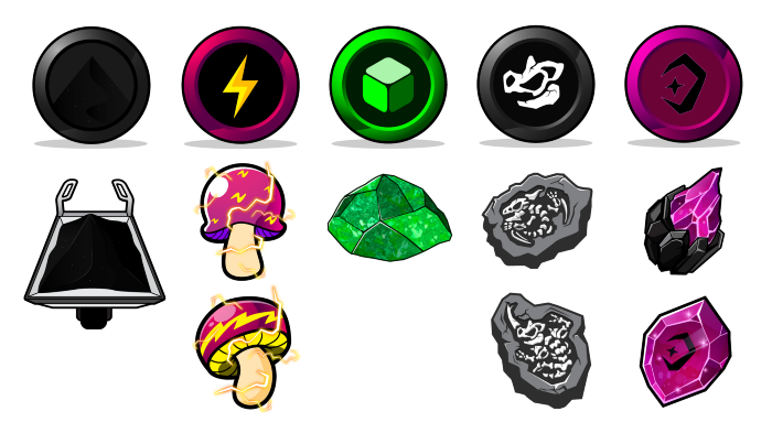 TOTHEMOONのメタバースでは、リソース・トークンは月のインフラを構築するために必要であり、さらに特定のリソースNFTに関連付けられ、追加的な利益を得ることができるようになります。5種類のNEP-17リソース・トークンとそれに関連するリソースNFTは、ステーク報酬を増やし、対応するムーン・インフラストラクチャを構築するためのステーク要件を減らすことができます。下の画像では、上段のトークン記号がリソース・トークン(左からTGAS、WATT、LITH、HIST、MAG)であり、それぞれの下に関連するリソースNFT記号が表示されています。